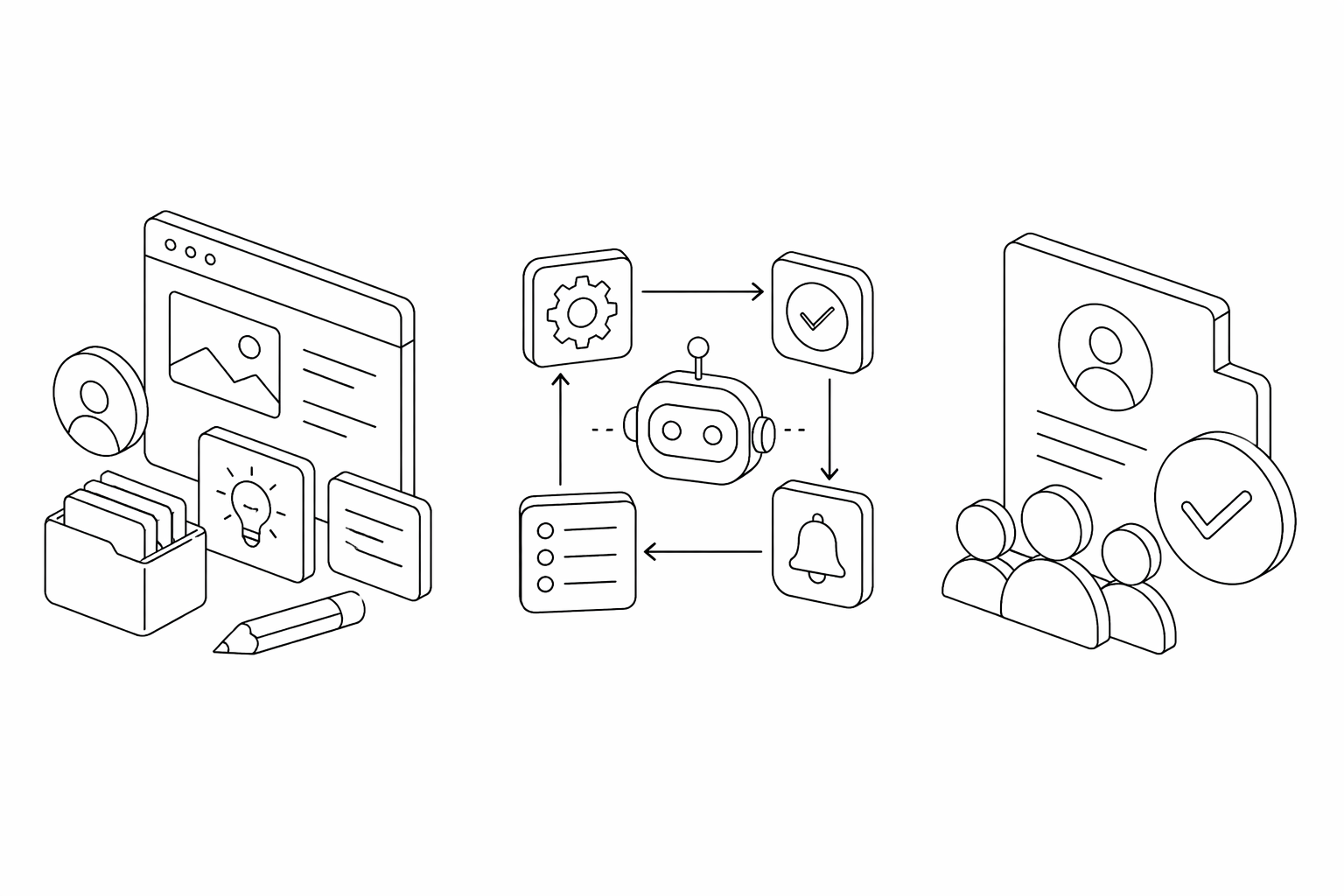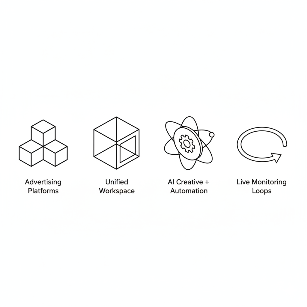 AI agents assemble static concepts, resize formats, generate variants, and push fresh creative combinations into the testing queue.